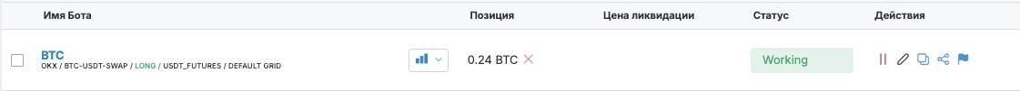 Position Displayed to the right of the bot name. In Auto Grid and Dynamic modes, there may be no net position, but the bot can still have open triggers. This means Long and Short positions are equal. When the price moves in either direction, the position will reappear or be reopened.