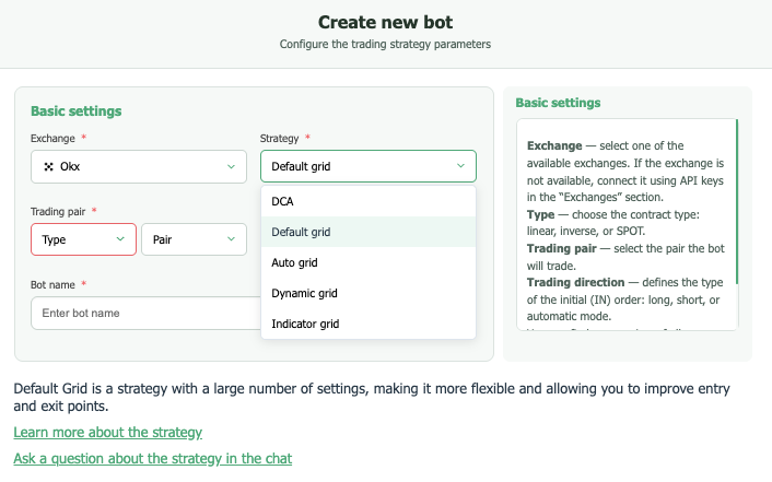 Default is a classic one-direction strategy. The bot supports both long and short positions, offering simple setup and reliability for traders who prefer a more conservative approach.