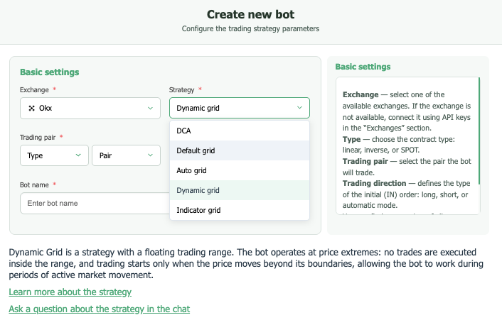 The key feature of the Dynamic bot is the use of floating trading range boundaries that automatically adjust based on the price movement. Two additional parameters are used to configure these floating boundaries: Start Offset (%) and IN Execute Offset (%).