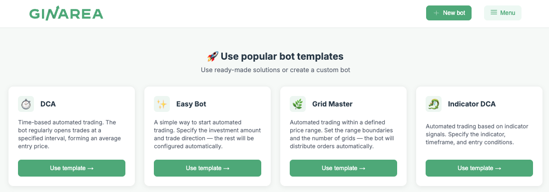 **Templates**  are a simple and fast way to launch automated trading. You have access to three pre-configured templates, each optimized for different trading strategies. Choose the one that suits you, set the key parameters, and the system will automatically calculate the rest. After creating the bot, you can always edit any settings manually.